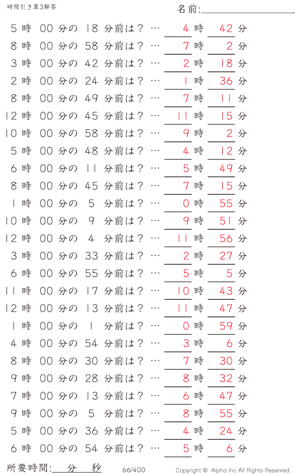 時間引き算3:1分単位(0分から)の問題解答ガイド