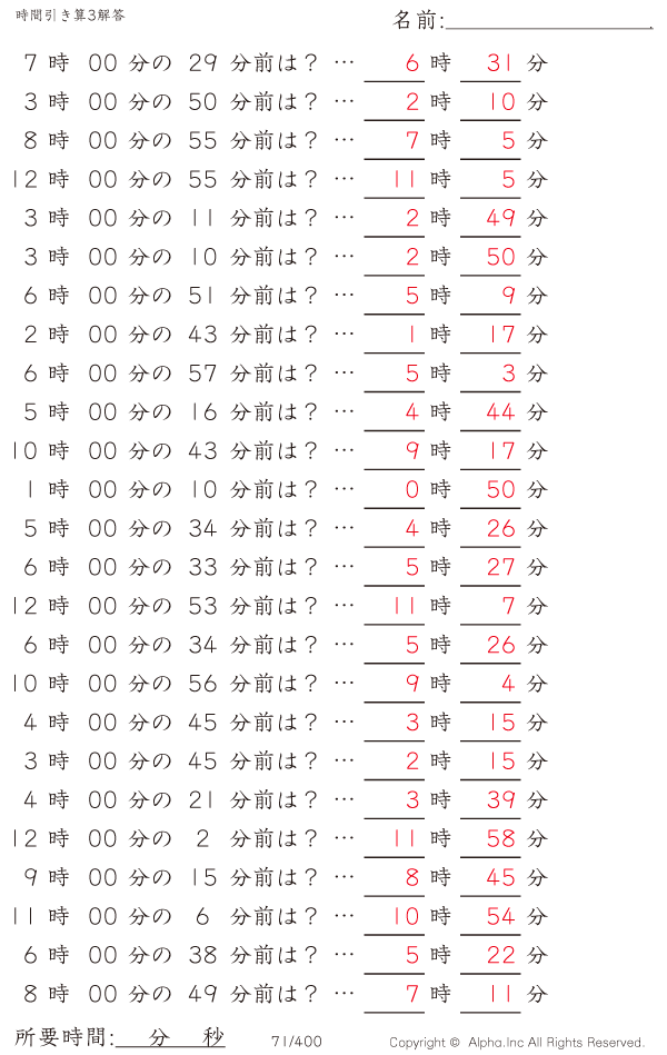 時間引き算3:1分単位(0分から)の問題解答ガイド
