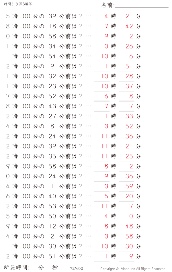 時間引き算3:1分単位(0分から)の問題解答ガイド