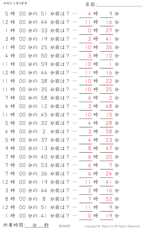 時間引き算3:1分単位(0分から)の問題解答ガイド