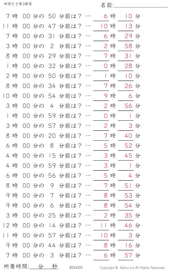 時間引き算3:1分単位(0分から)の問題解答ガイド
