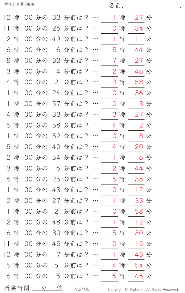 上記のボタンから「時間引き算3:1分単位(0分から)」の算数数学ドリル・計算ドリル(PDFプリント)がダウンロードできます。個人利用は無料です(家庭以外での配布は有料です)。