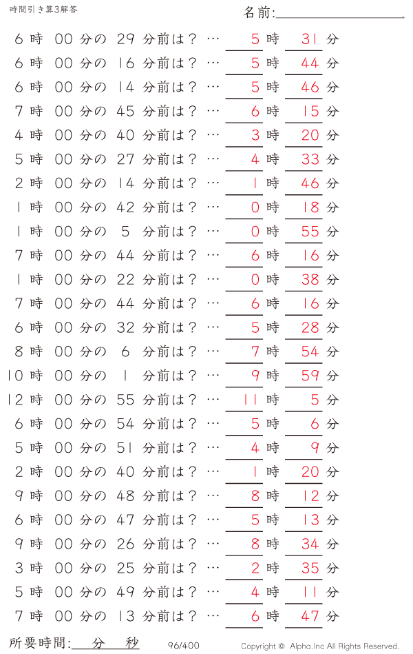 時間引き算3:1分単位(0分から) [解答]096/400