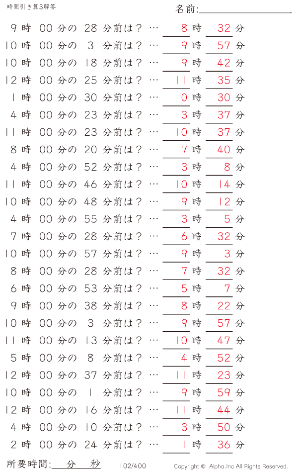 時間引き算3:1分単位(0分から) [解答]102/400