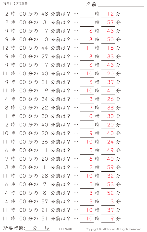 時間引き算3:1分単位(0分から) [解答]111/400