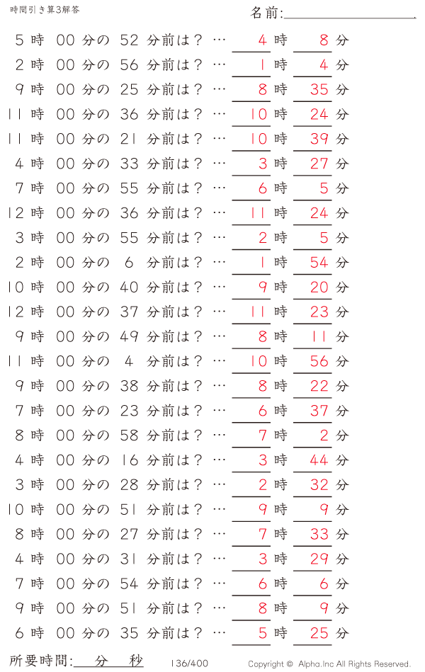 時間引き算3:1分単位(0分から)の問題解答ガイド