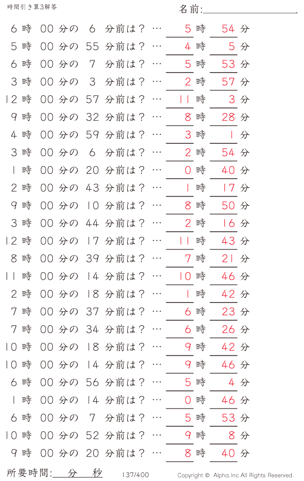 上記のボタンから「時間引き算3:1分単位(0分から)」の算数数学ドリル・計算ドリル(PDFプリント)がダウンロードできます。個人利用は無料です(家庭以外での配布は有料です)。