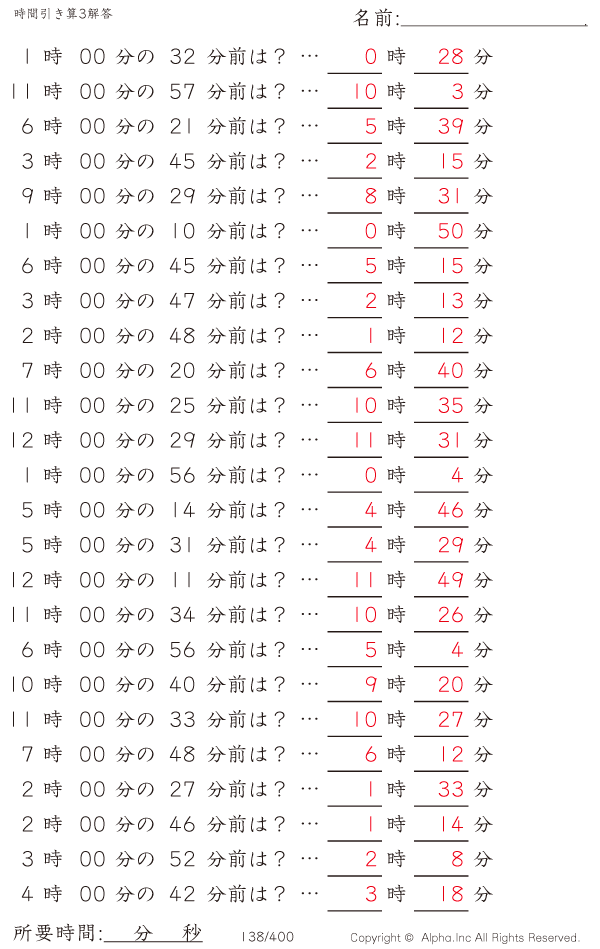 時間引き算3:1分単位(0分から)の問題解答ガイド