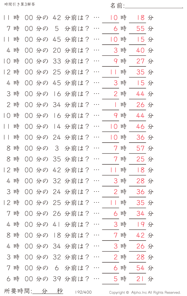 上記のボタンから「時間引き算3:1分単位(0分から)」の算数数学ドリル・計算ドリル(PDFプリント)がダウンロードできます。個人利用は無料です(家庭以外での配布は有料です)。