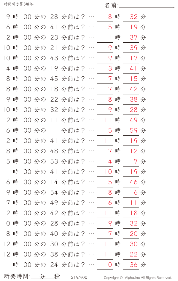 上記のボタンから「時間引き算3:1分単位(0分から)」の算数数学ドリル・計算ドリル(PDFプリント)がダウンロードできます。個人利用は無料です(家庭以外での配布は有料です)。