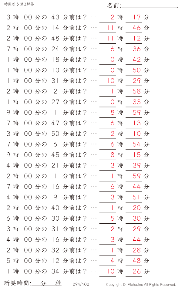 上記のボタンから「時間引き算3:1分単位(0分から)」の算数数学ドリル・計算ドリル(PDFプリント)がダウンロードできます。個人利用は無料です(家庭以外での配布は有料です)。