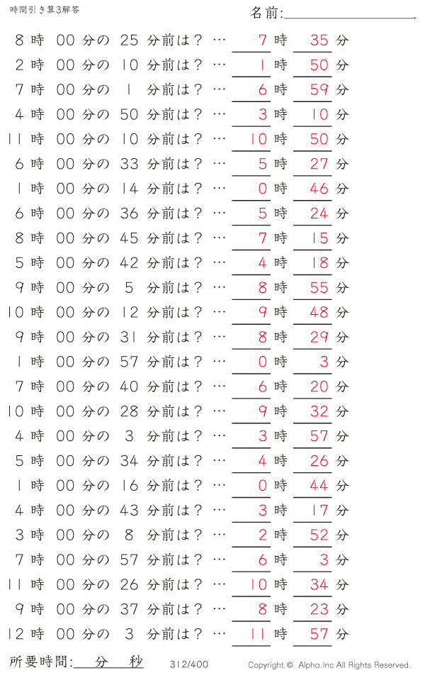 上記のボタンから「時間引き算3:1分単位(0分から)」の算数数学ドリル・計算ドリル(PDFプリント)がダウンロードできます。個人利用は無料です(家庭以外での配布は有料です)。