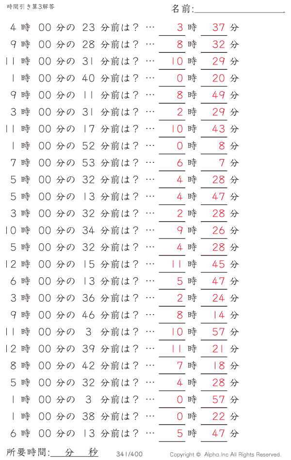 時間引き算3:1分単位(0分から) [解答]341/400