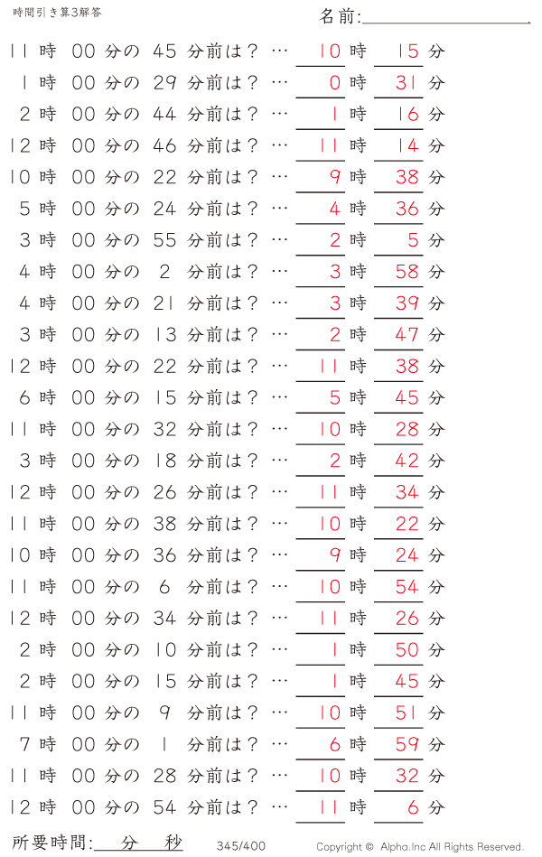 時間引き算3:1分単位(0分から)の問題解答ガイド