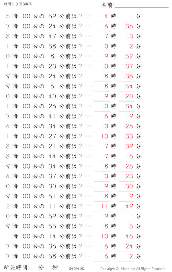 時間引き算3:1分単位(0分から) [解答]346/400