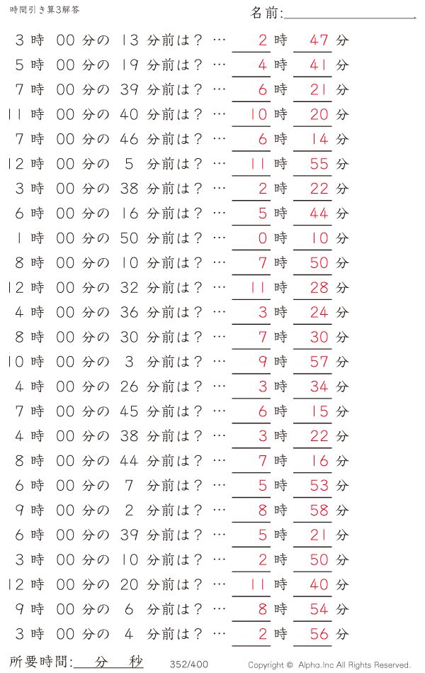 時間引き算3:1分単位(0分から)の問題解答ガイド