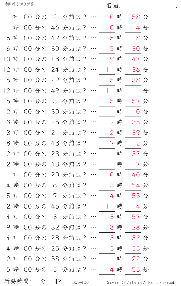 時間引き算3:1分単位(0分から) [解答]356/400