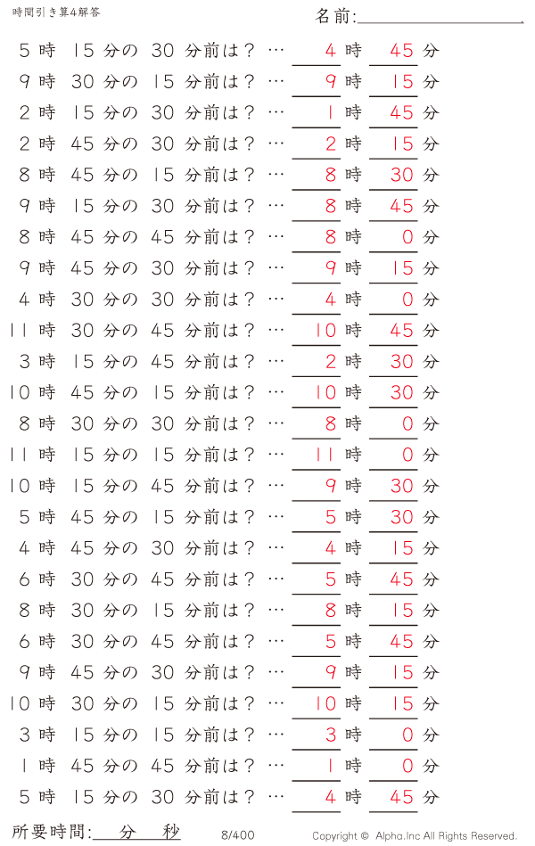 上記のボタンから「時間引き算4:15分単位」の算数数学ドリル・計算ドリル(PDFプリント)がダウンロードできます。個人利用は無料です(家庭以外での配布は有料です)。