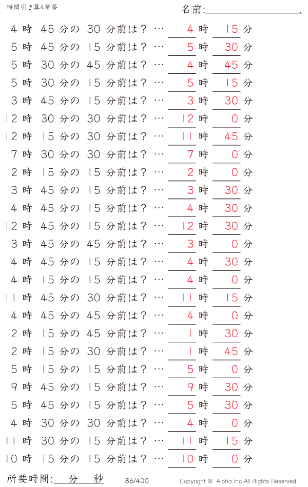 上記のボタンから「時間引き算4:15分単位」の算数数学ドリル・計算ドリル(PDFプリント)がダウンロードできます。個人利用は無料です(家庭以外での配布は有料です)。