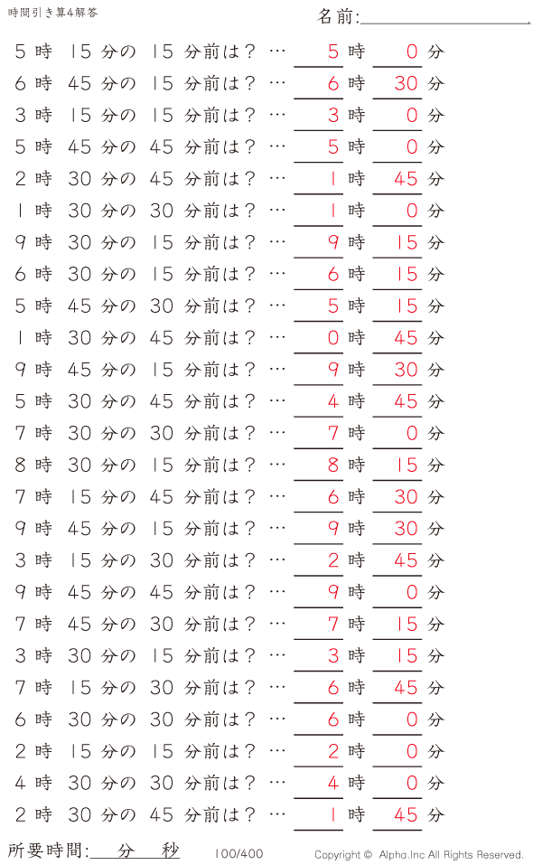 上記のボタンから「時間引き算4:15分単位」の算数数学ドリル・計算ドリル(PDFプリント)がダウンロードできます。個人利用は無料です(家庭以外での配布は有料です)。