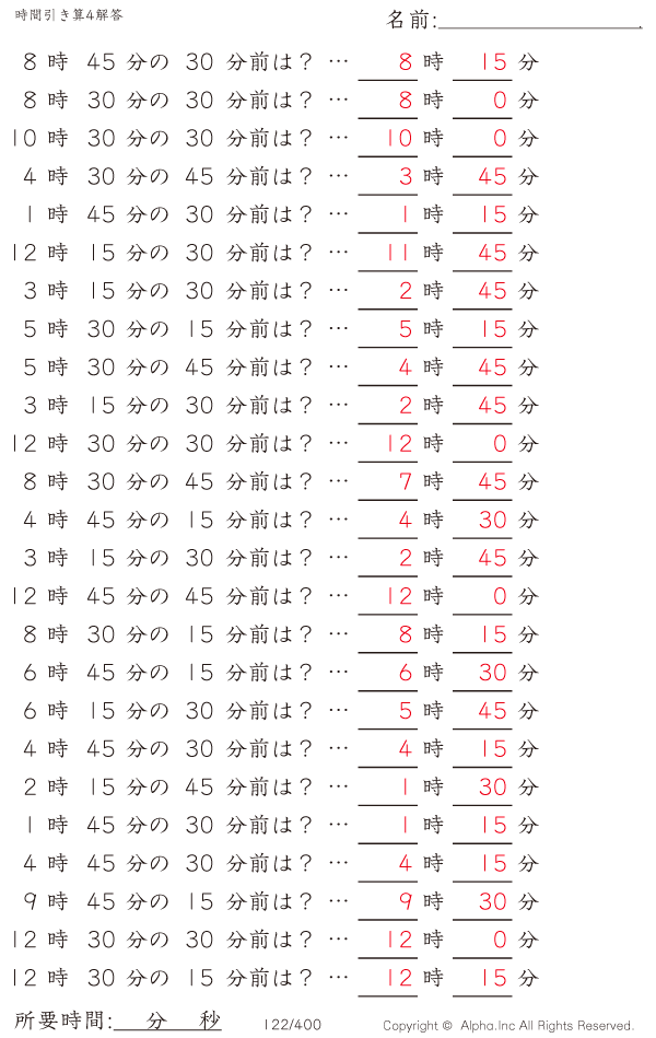 上記のボタンから「時間引き算4:15分単位」の算数数学ドリル・計算ドリル(PDFプリント)がダウンロードできます。個人利用は無料です(家庭以外での配布は有料です)。