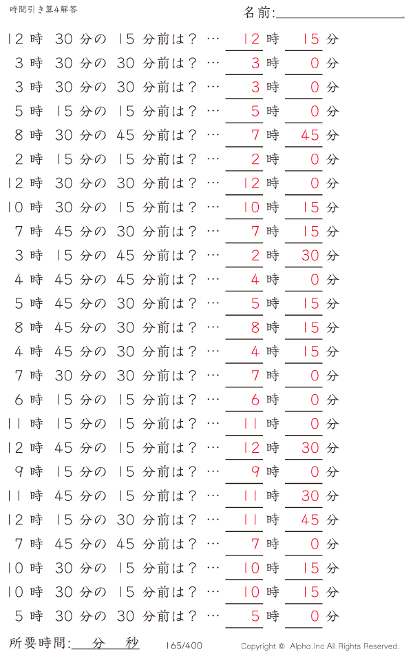 上記のボタンから「時間引き算4:15分単位」の算数数学ドリル・計算ドリル(PDFプリント)がダウンロードできます。個人利用は無料です(家庭以外での配布は有料です)。