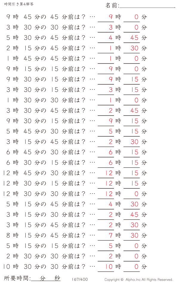 上記のボタンから「時間引き算4:15分単位」の算数数学ドリル・計算ドリル(PDFプリント)がダウンロードできます。個人利用は無料です(家庭以外での配布は有料です)。