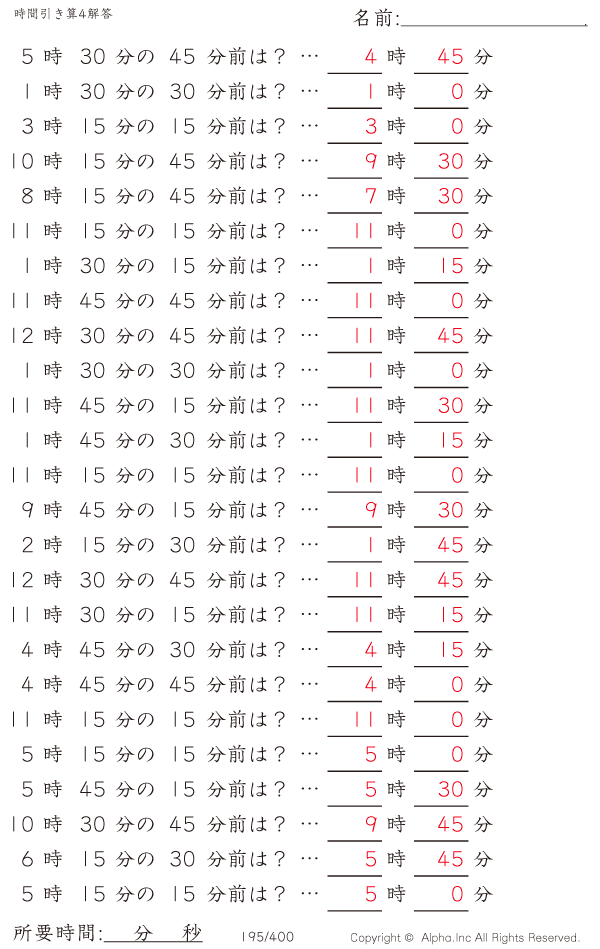 上記のボタンから「時間引き算4:15分単位」の算数数学ドリル・計算ドリル(PDFプリント)がダウンロードできます。個人利用は無料です(家庭以外での配布は有料です)。