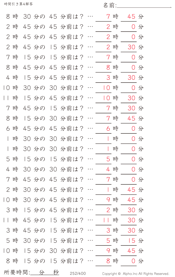 時間引き算4:15分単位 [解答]252/400