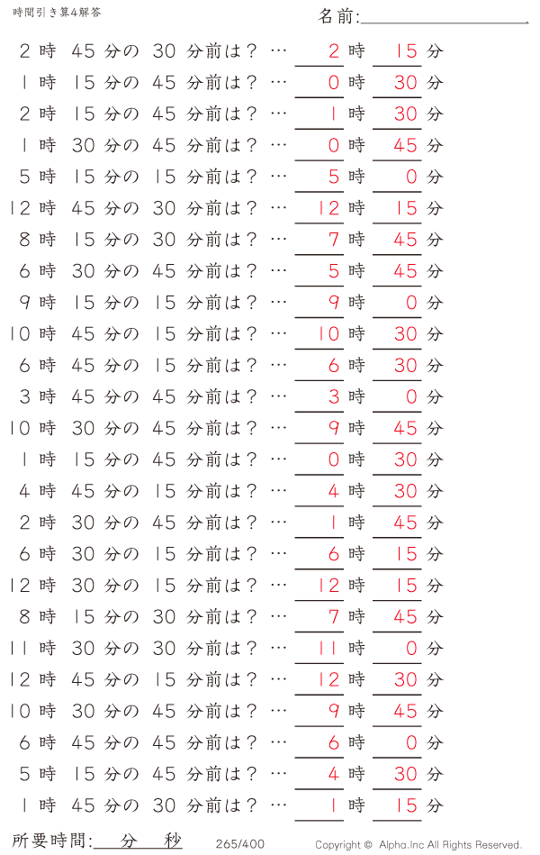 上記のボタンから「時間引き算4:15分単位」の算数数学ドリル・計算ドリル(PDFプリント)がダウンロードできます。個人利用は無料です(家庭以外での配布は有料です)。