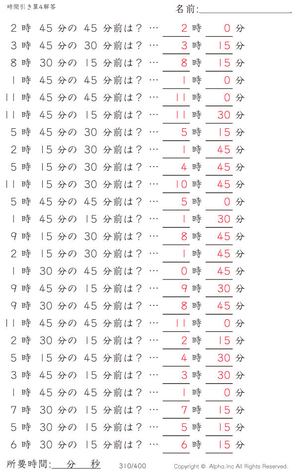 上記のボタンから「時間引き算4:15分単位」の算数数学ドリル・計算ドリル(PDFプリント)がダウンロードできます。個人利用は無料です(家庭以外での配布は有料です)。