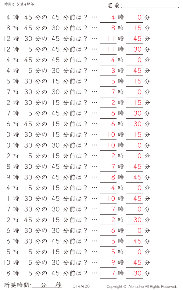 上記のボタンから「時間引き算4:15分単位」の算数数学ドリル・計算ドリル(PDFプリント)がダウンロードできます。個人利用は無料です(家庭以外での配布は有料です)。