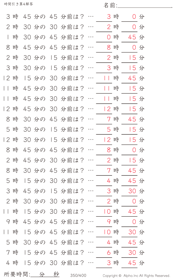 上記のボタンから「時間引き算4:15分単位」の算数数学ドリル・計算ドリル(PDFプリント)がダウンロードできます。個人利用は無料です(家庭以外での配布は有料です)。