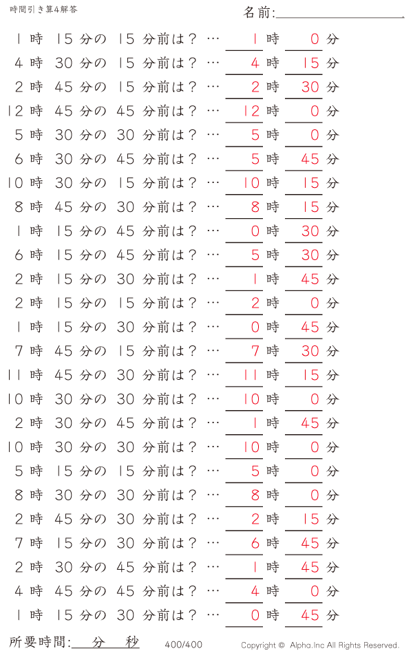 上記のボタンから「時間引き算4:15分単位」の算数数学ドリル・計算ドリル(PDFプリント)がダウンロードできます。個人利用は無料です(家庭以外での配布は有料です)。