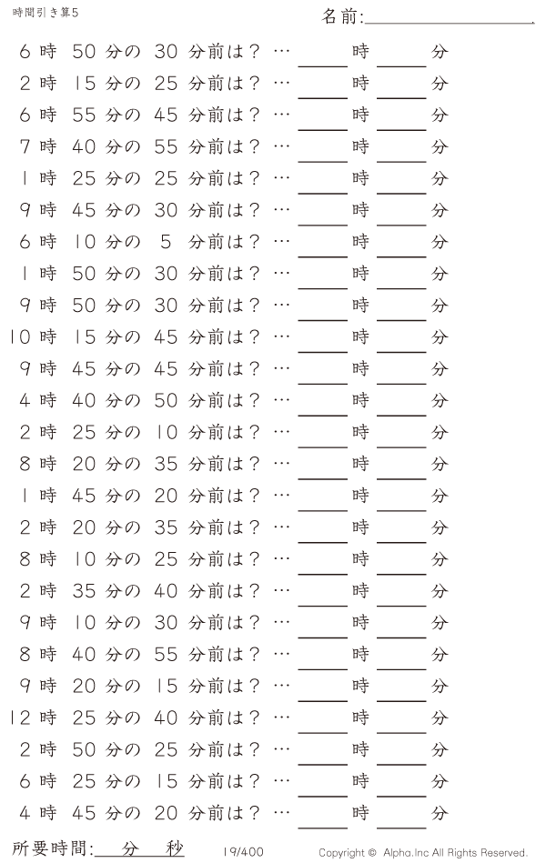 上記のボタンから「時間引き算5:5分単位」の算数数学ドリル・計算ドリル(PDFプリント)がダウンロードできます。個人利用は無料です(家庭以外での配布は有料です)。