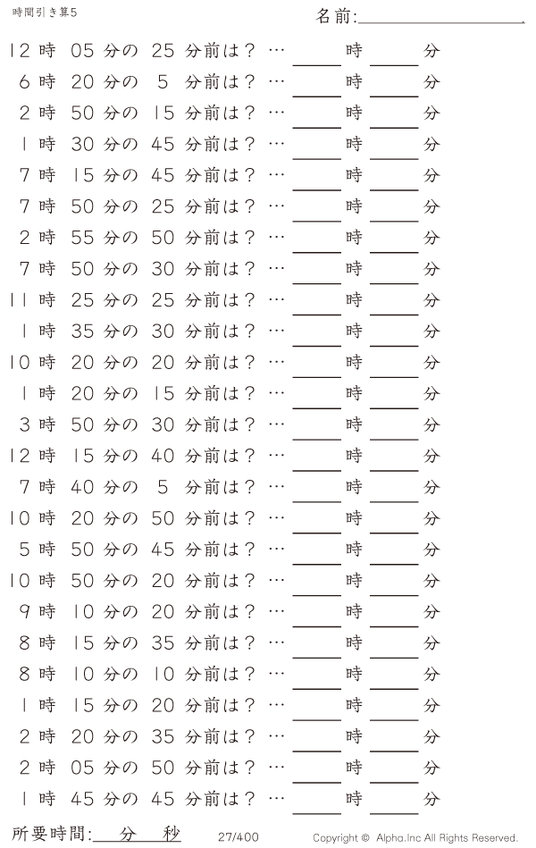 上記のボタンから「時間引き算5:5分単位」の算数数学ドリル・計算ドリル(PDFプリント)がダウンロードできます。個人利用は無料です(家庭以外での配布は有料です)。