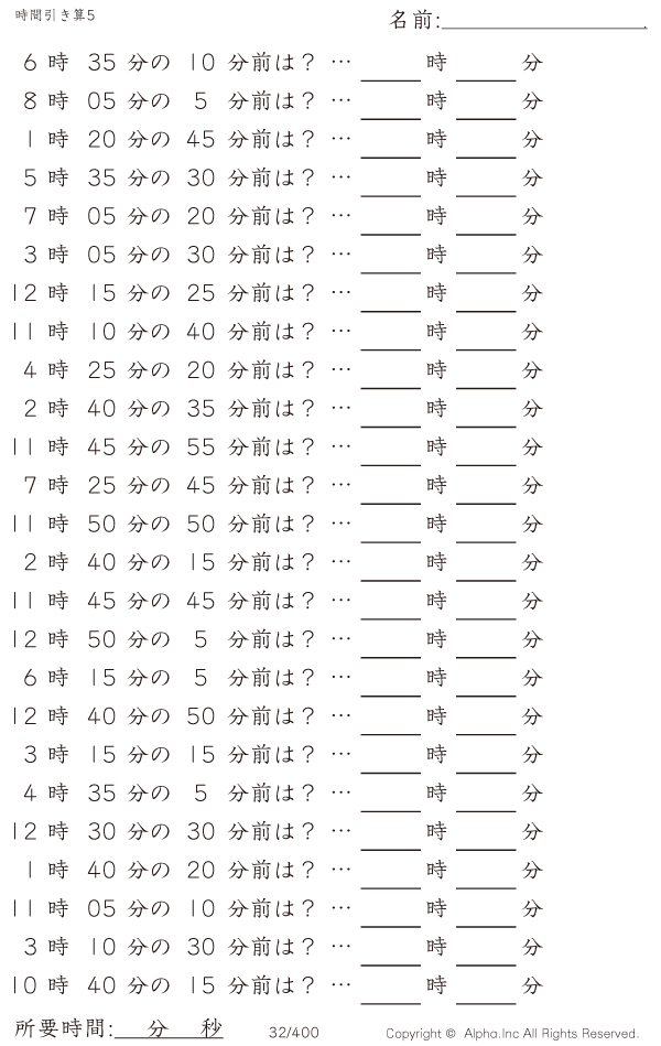 上記のボタンから「時間引き算5:5分単位」の算数数学ドリル・計算ドリル(PDFプリント)がダウンロードできます。個人利用は無料です(家庭以外での配布は有料です)。