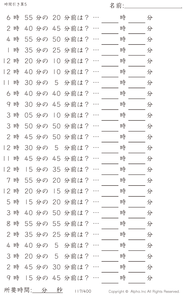 時間引き算5:5分単位 [問題]117/400