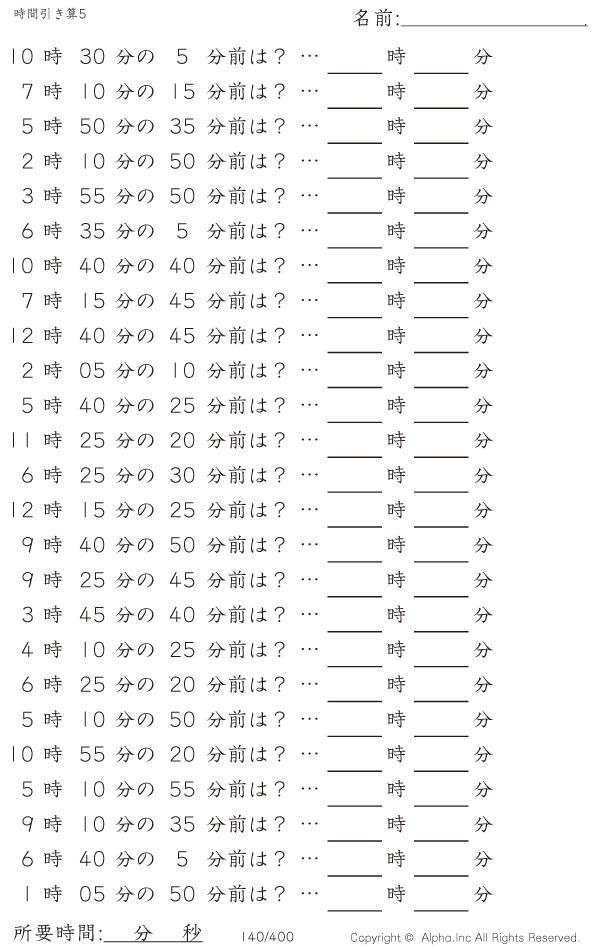 時間引き算5:5分単位 [問題]140/400