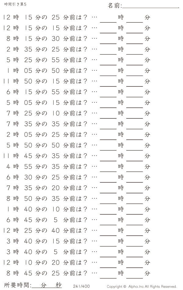 時間引き算5:5分単位 [問題]241/400