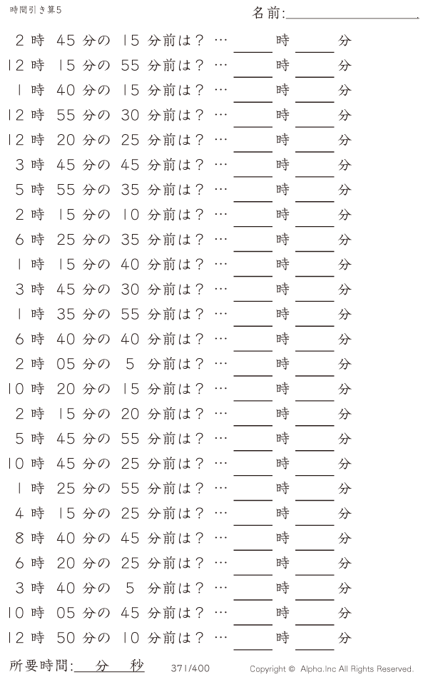 時間引き算5:5分単位 [問題]371/400
