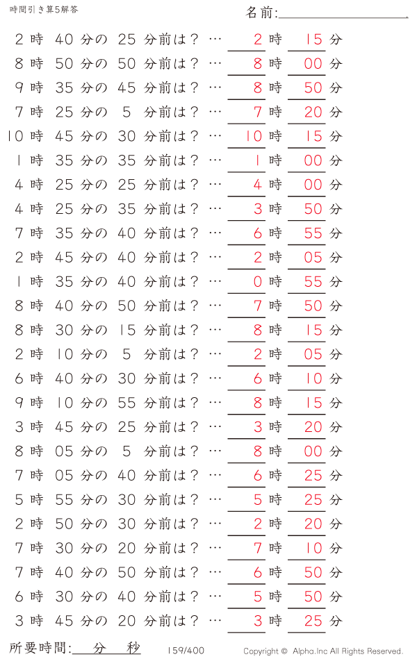 上記のボタンから「時間引き算5:5分単位」の算数数学ドリル・計算ドリル(PDFプリント)がダウンロードできます。個人利用は無料です(家庭以外での配布は有料です)。
