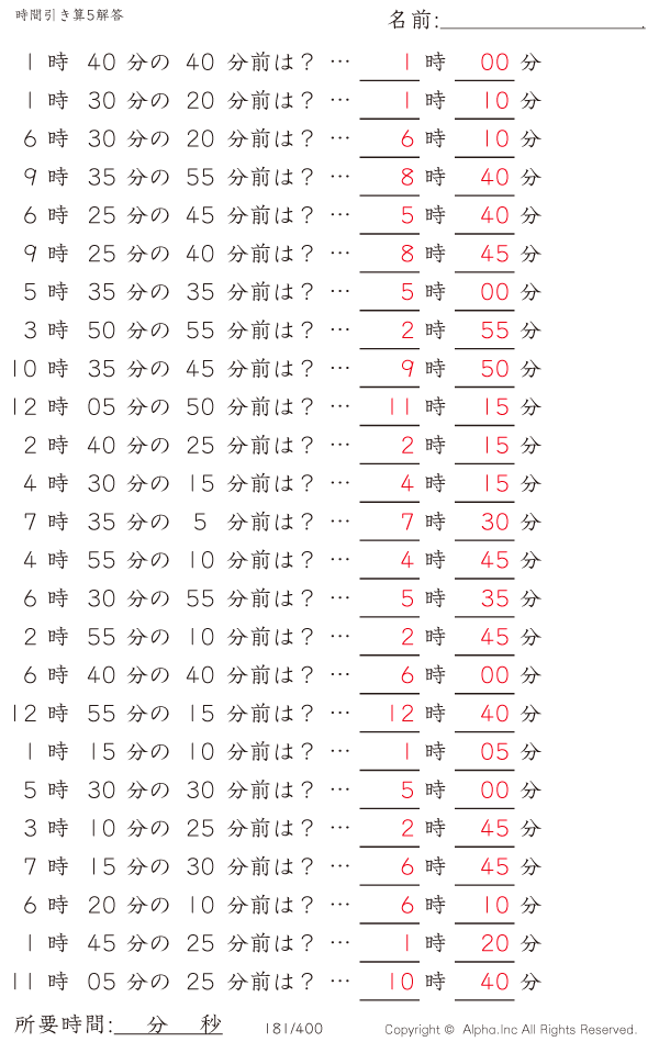 上記のボタンから「時間引き算5:5分単位」の算数数学ドリル・計算ドリル(PDFプリント)がダウンロードできます。個人利用は無料です(家庭以外での配布は有料です)。