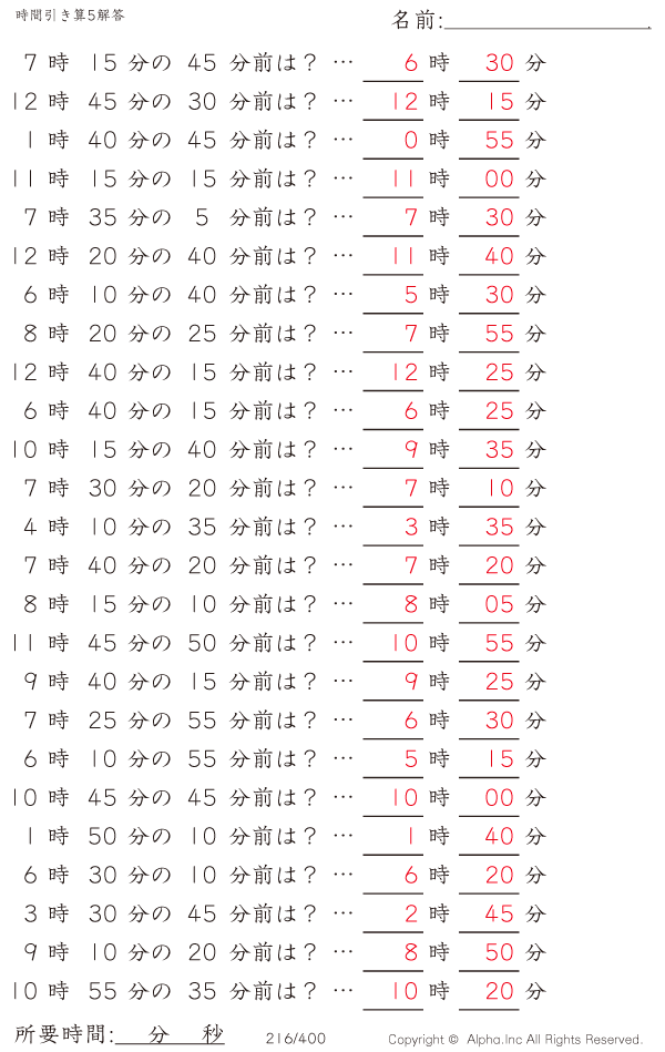 上記のボタンから「時間引き算5:5分単位」の算数数学ドリル・計算ドリル(PDFプリント)がダウンロードできます。個人利用は無料です(家庭以外での配布は有料です)。