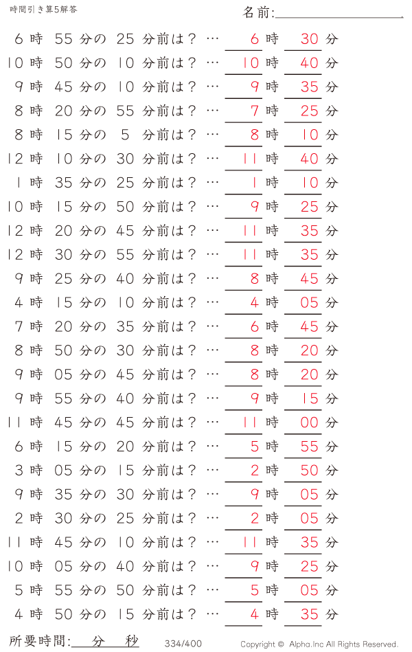 上記のボタンから「時間引き算5:5分単位」の算数数学ドリル・計算ドリル(PDFプリント)がダウンロードできます。個人利用は無料です(家庭以外での配布は有料です)。