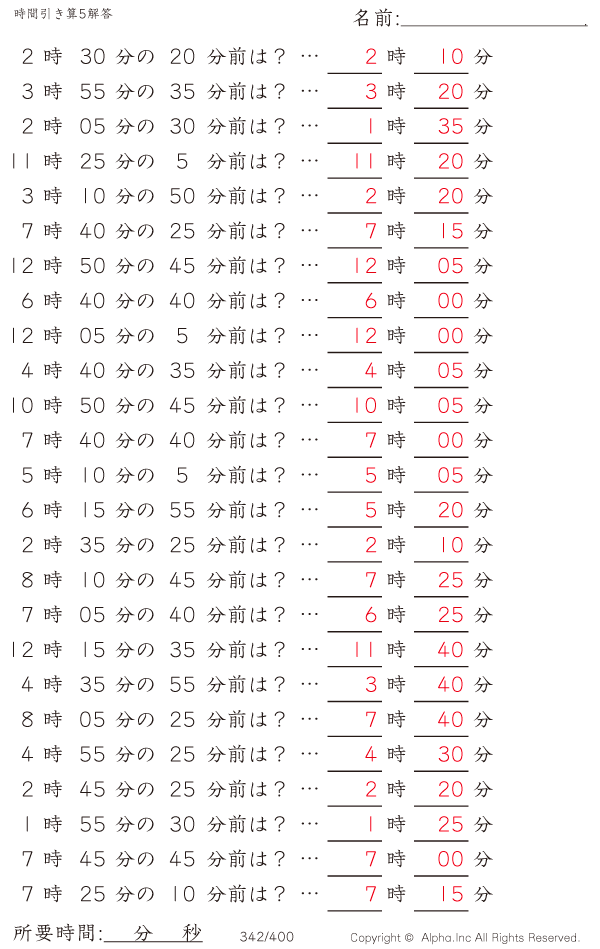 時間引き算5:5分単位 [解答]342/400
