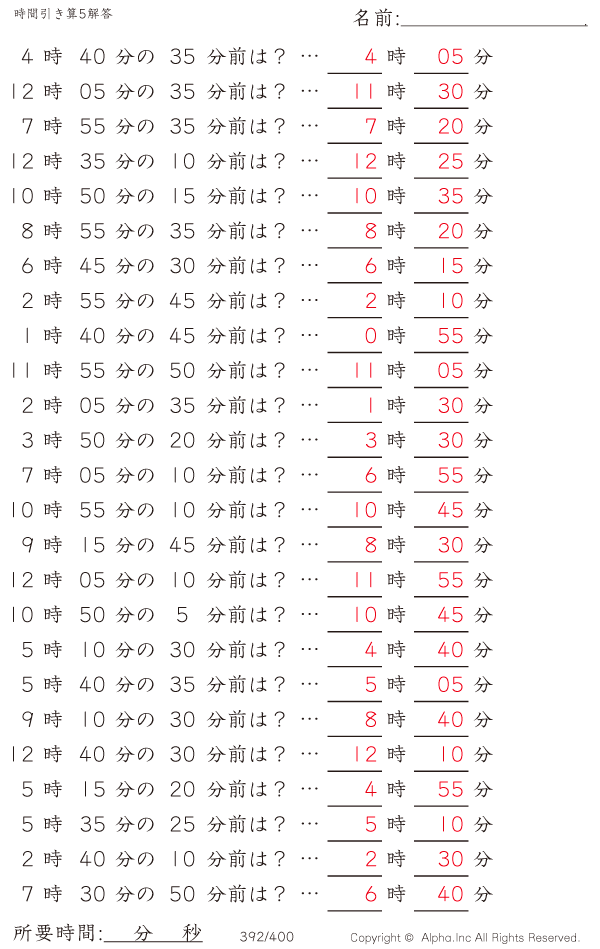上記のボタンから「時間引き算5:5分単位」の算数数学ドリル・計算ドリル(PDFプリント)がダウンロードできます。個人利用は無料です(家庭以外での配布は有料です)。