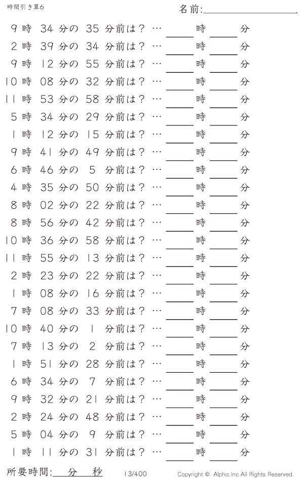 上記のボタンから「時間引き算6:1分単位」の算数数学ドリル・計算ドリル(PDFプリント)がダウンロードできます。個人利用は無料です(家庭以外での配布は有料です)。