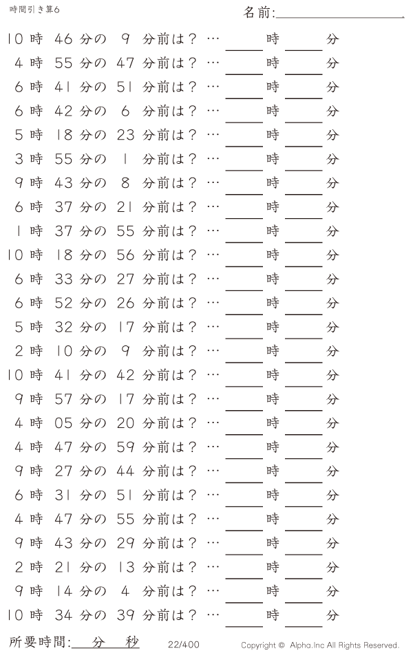 上記のボタンから「時間引き算6:1分単位」の算数数学ドリル・計算ドリル(PDFプリント)がダウンロードできます。個人利用は無料です(家庭以外での配布は有料です)。