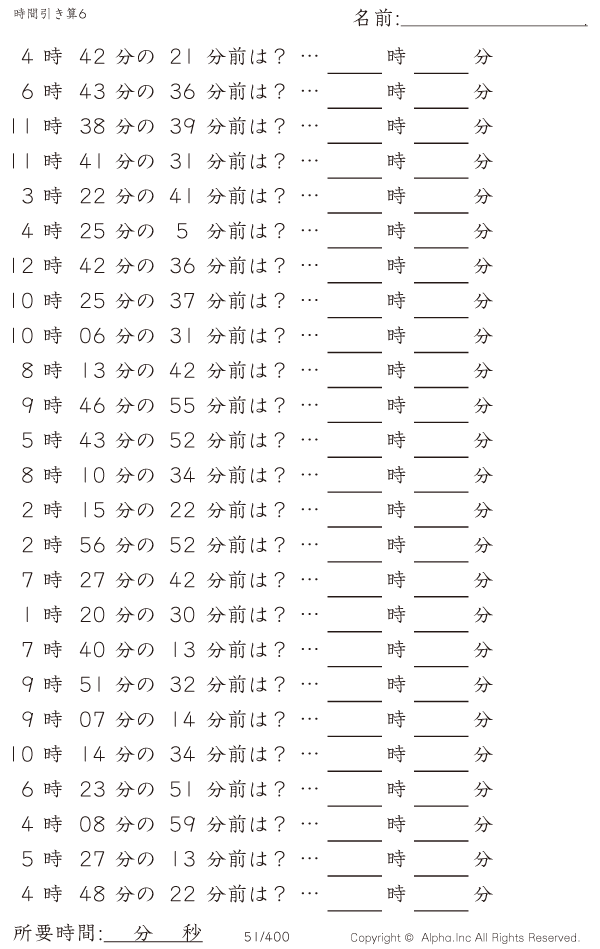 上記のボタンから「時間引き算6:1分単位」の算数数学ドリル・計算ドリル(PDFプリント)がダウンロードできます。個人利用は無料です(家庭以外での配布は有料です)。